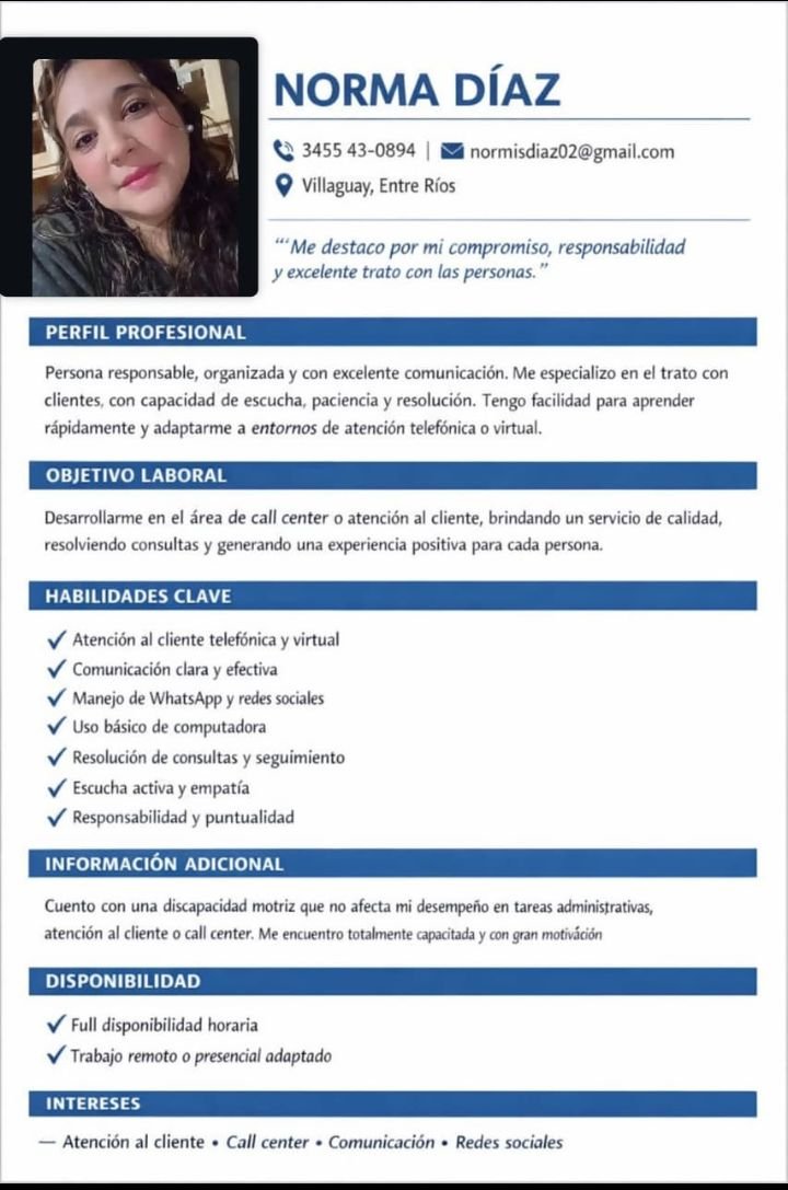 Me destaco por mi productividad, rapidez de aprendizaje, capacidad de adaptación y excelente trato interpersonal. Cuento con CUD vigente.