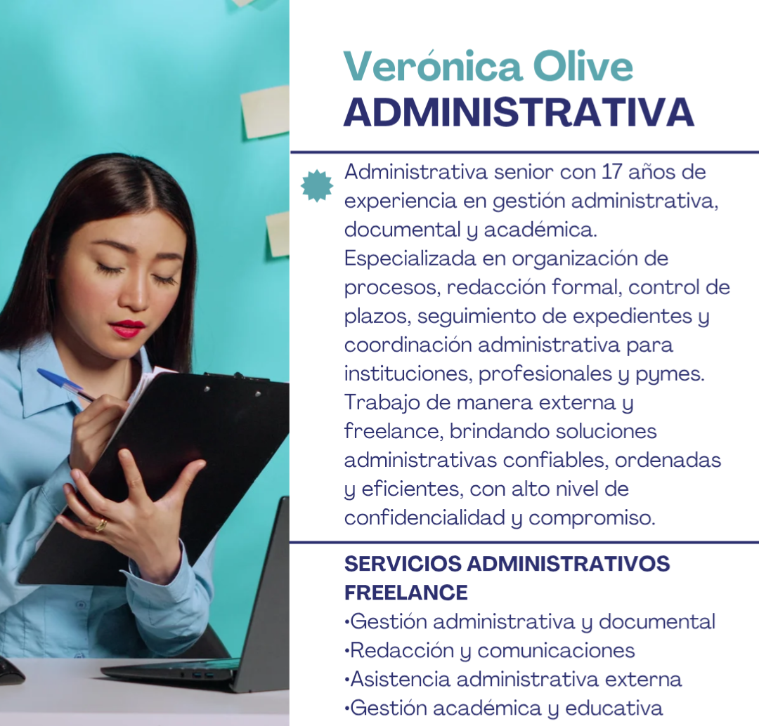 Soy Verónica Olive, administrativa y asistente virtual con amplia experiencia en gestión administrativa, atención al cliente y soporte operativo, especialmente en el sector educativo.