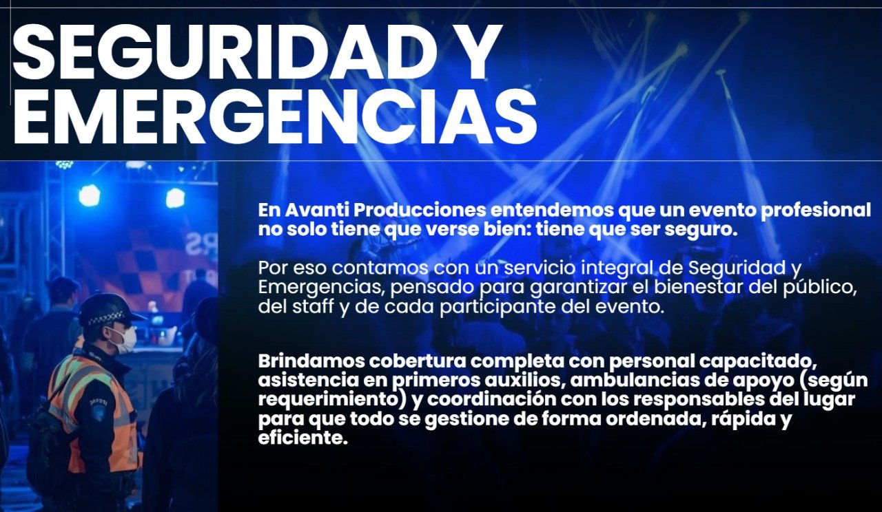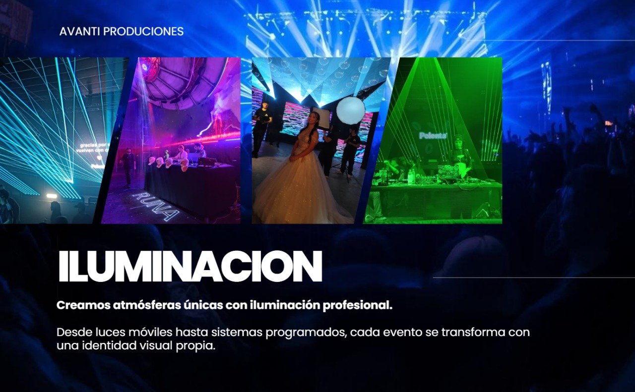 Avanti Producciones es una productora técnica integral especializada en sonido, iluminación, pantallas LED, proyección, montaje de escenarios, servicio de DJ y efectos especiales. Además, contamos con opciones de seguridad, paramédicos y ambulancia para garantizar eventos seguros y completamente asistidos. Ofrecemos soluciones profesionales para instituciones educativas, empresas y eventos sociales.
