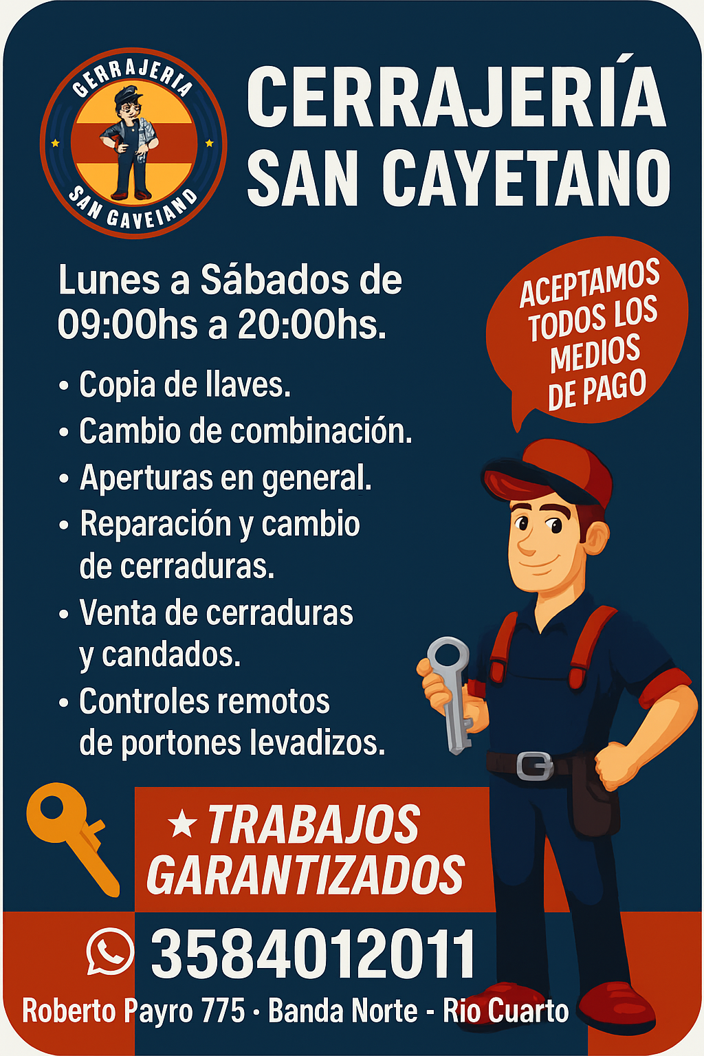 En Cerrajería San Cayetano trabajamos para brindarte soluciones rápidas, seguras y confiables. Realizamos aperturas, copias de llaves, instalación, reparación y mantenimiento de cerraduras para hogares, departamentos y comercios. Tu seguridad es nuestra prioridad.