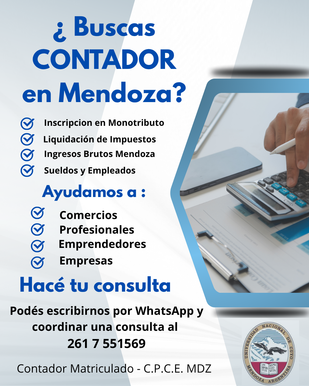 Buscas un Contador en Mendoza ? Ofrecemos inscripción en Monotributo , liquidación de impuestos, ingresos brutos Mendoza, suelos empleados, balances inventarios. Ayudamos a Comercios Profesionales Emprendedores y empresas WhatsApp 261 7 551569