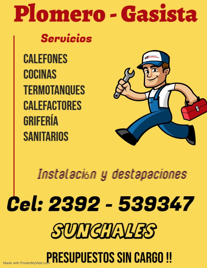 Gasista plomero matriculado, reparación de todo artefacto a gas, conexión de agua fría y caliente, destapaciones de cloacas y graseras