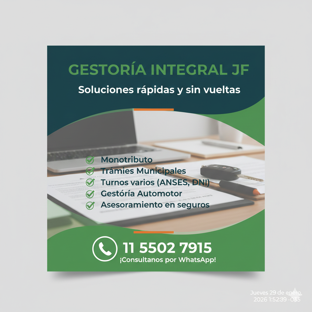 Asesoría contable, monotributo, Arca, Anses, Arba, Municipalidad, Mandataria Automotor, Planes de pago, Descuento en Infracciones/Multas, Turnos varios, Pago de Servicios, Inmobiliarios, Asesora de seguros, todo los tipos de trámites que necesites.. Equipo de trabajo con Abogados, Escribanos y Contadores.