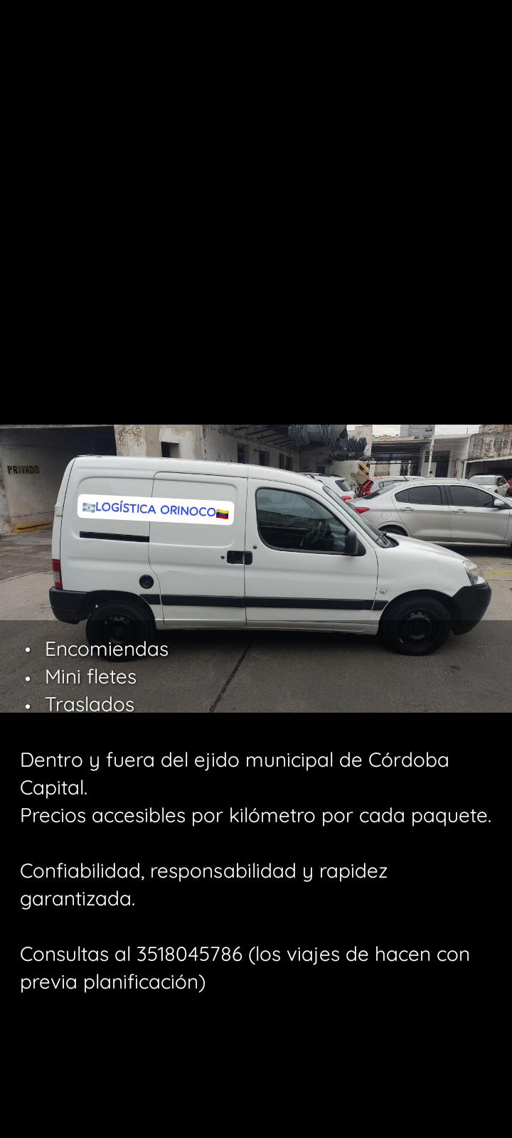 *Traslado de encomiendas, comisiones, cadeteria en general, mudanzas y repartos pequeños (hasta 600kg) dentro y fuera de Córdoba capital, incluyendo pueblos y ciudades cercanas a la misma dentro de la Provincia de Córdoba.