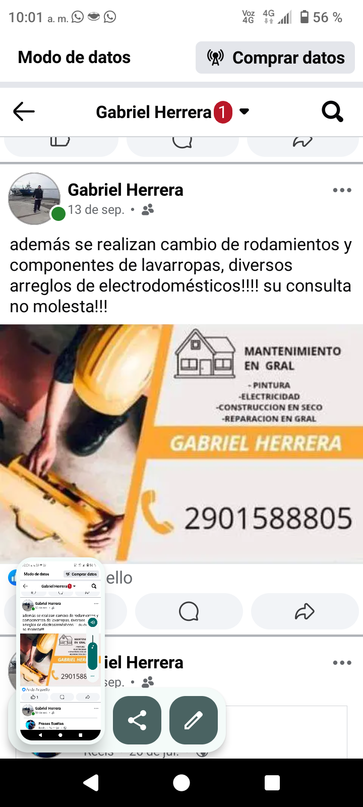 Se realizan trabajos de electricidad, reparación de paredes, pisos, plomería, pintura, reparación de electrodomésticos varios, su consulta no molesta.