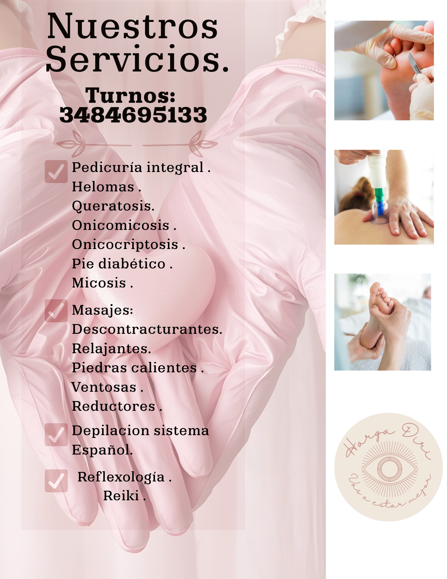 Masoterapeuta, pedicuría, depilación.