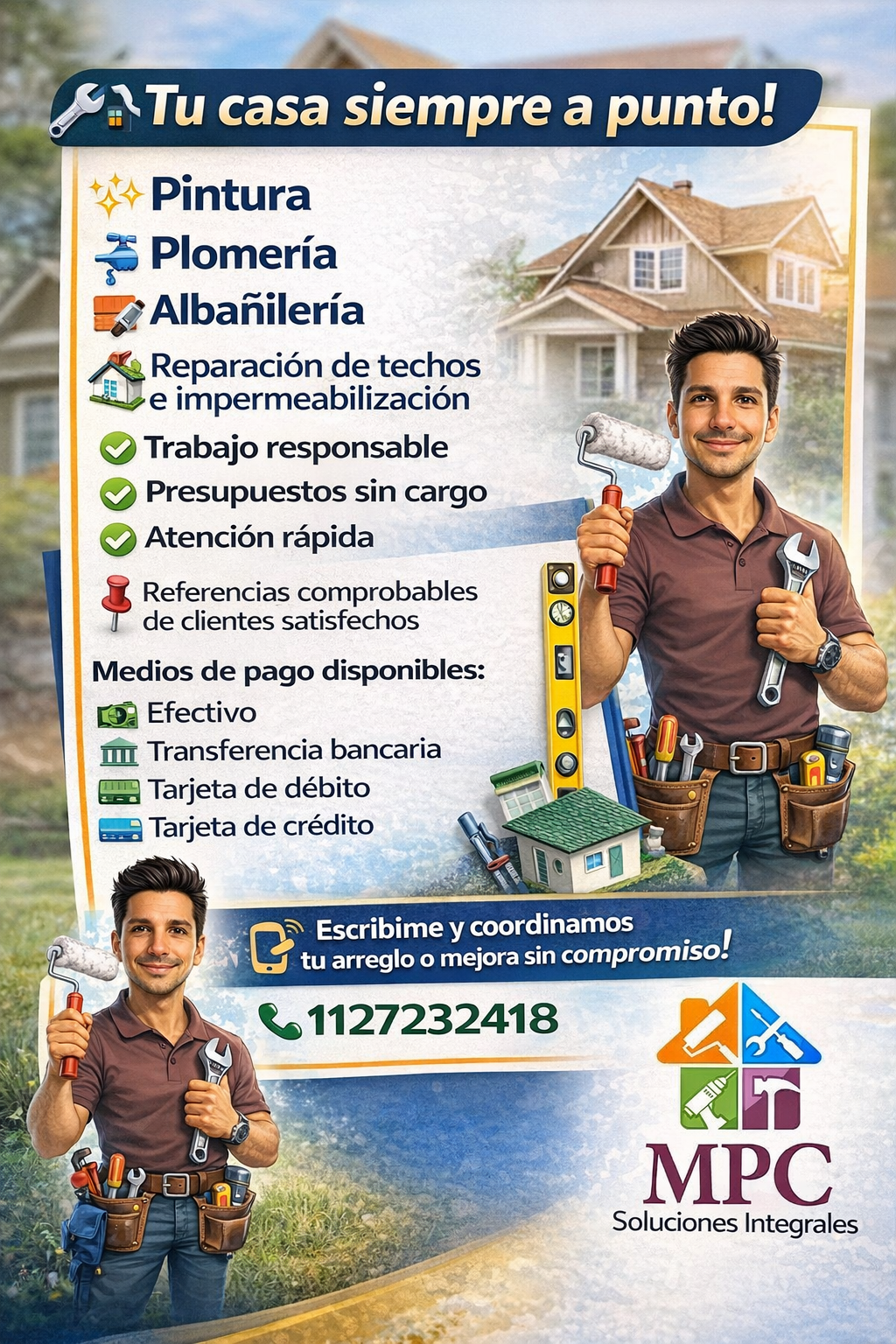 Trabajamos con referencias comprobables de clientes satisfechos y ofrecemos diferentes medios de pago para mayor comodidad. Si necesitás arreglar, mejorar o mantener tu casa, escribinos por WhatsApp al 1127232418 y coordinamos tu servicio sin compromiso. 🏠🔧