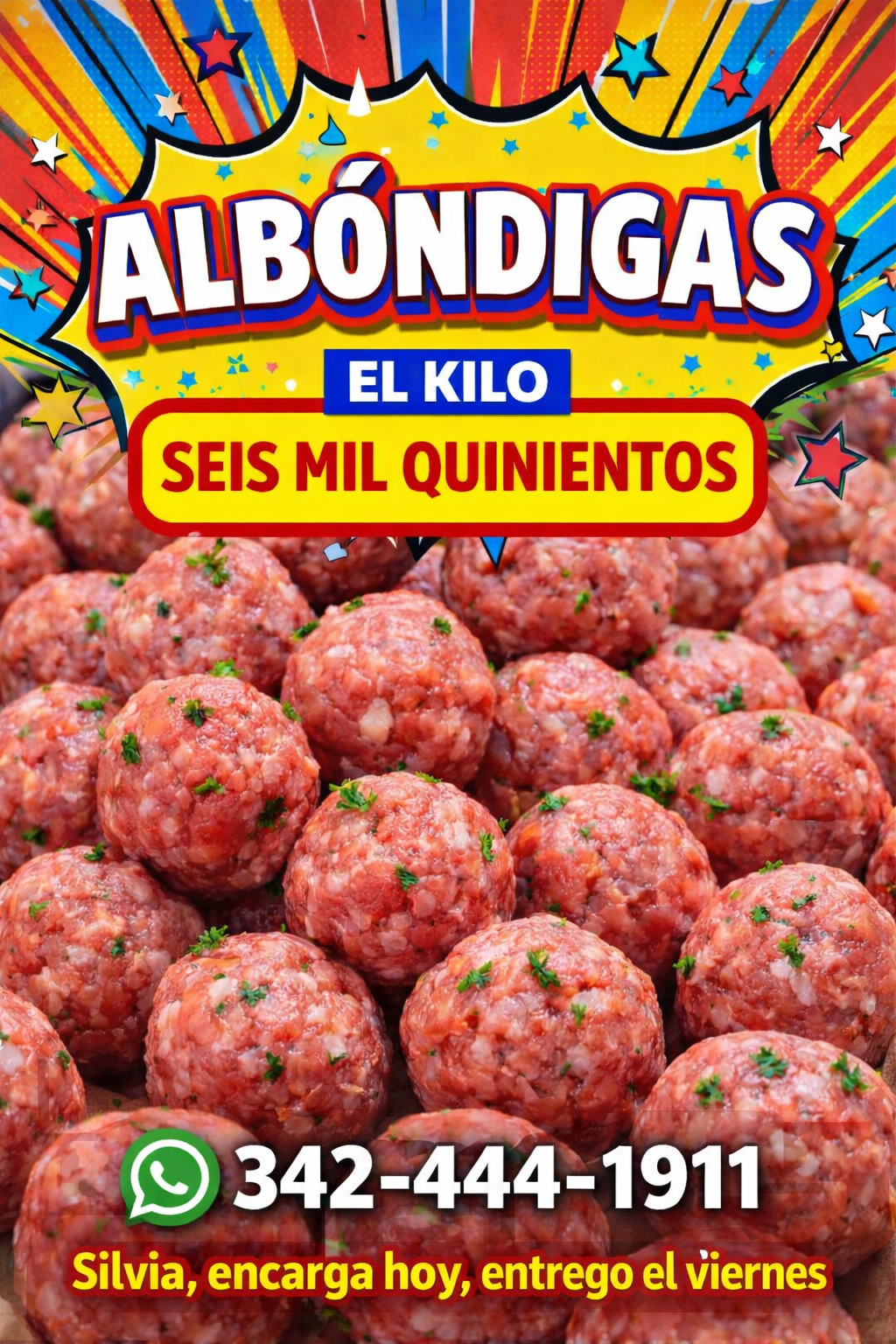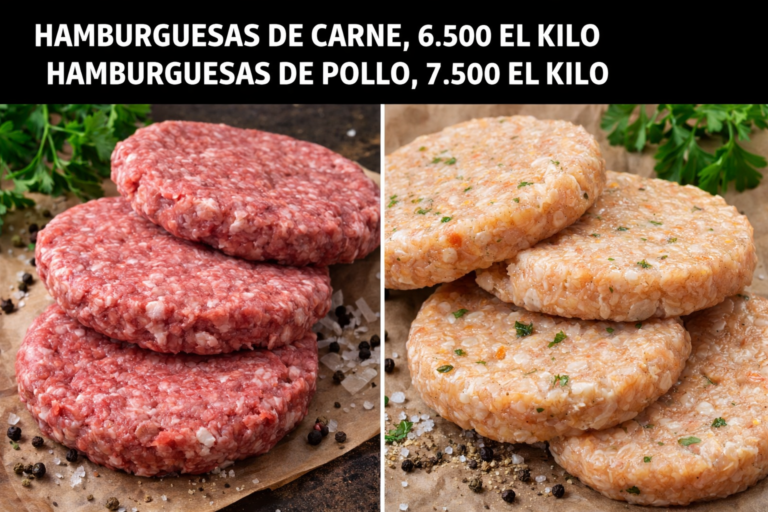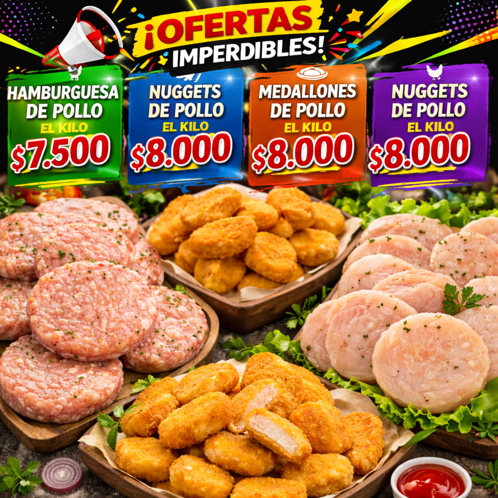 Elaboración de hamburguesas de carne 6500 kg de pollo 7500 kg , albóndigas 6500 kg, patinesas $6500 kg, patitas de pollo 8000 kg, medallones 8000 kg y nugget 8000 kg