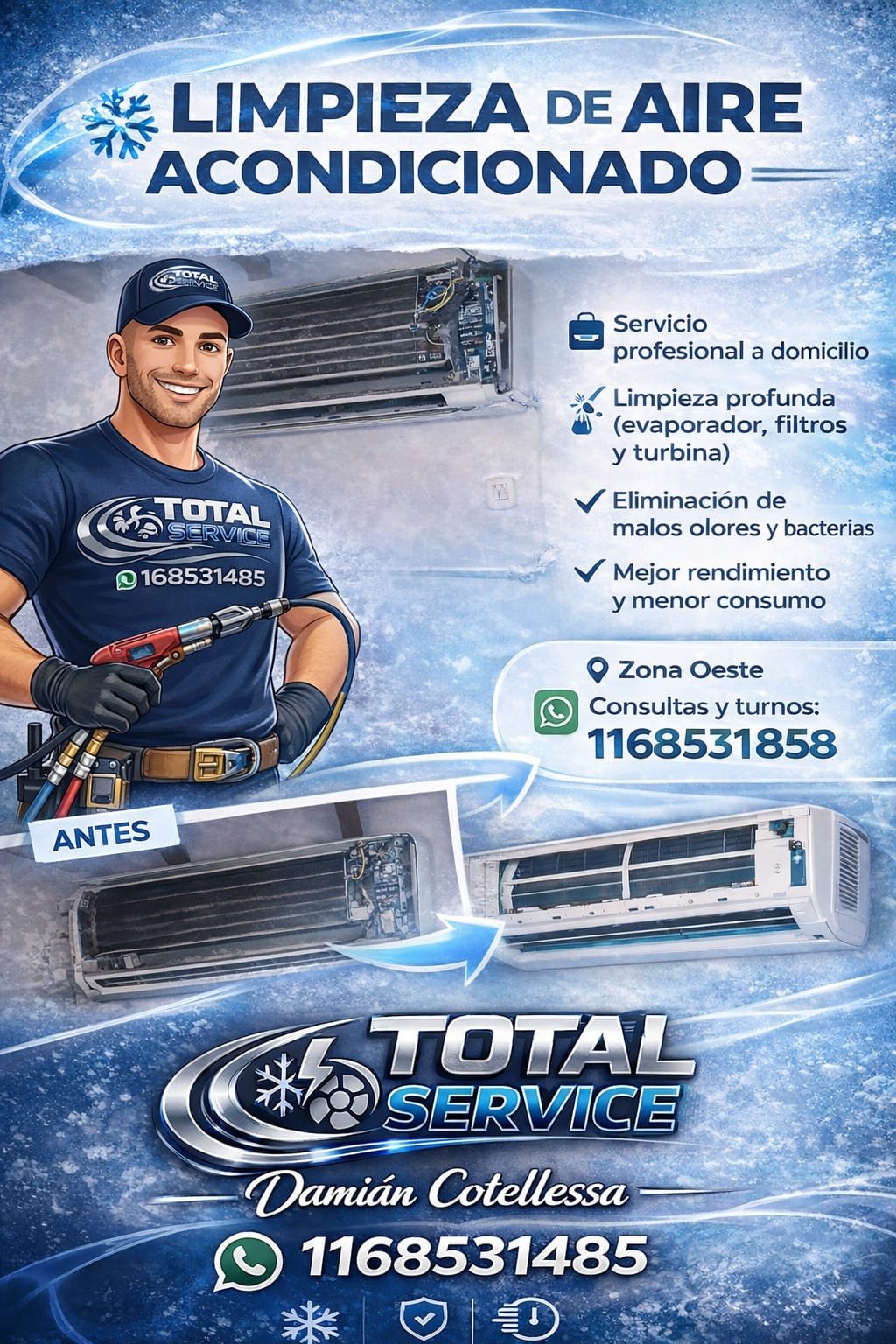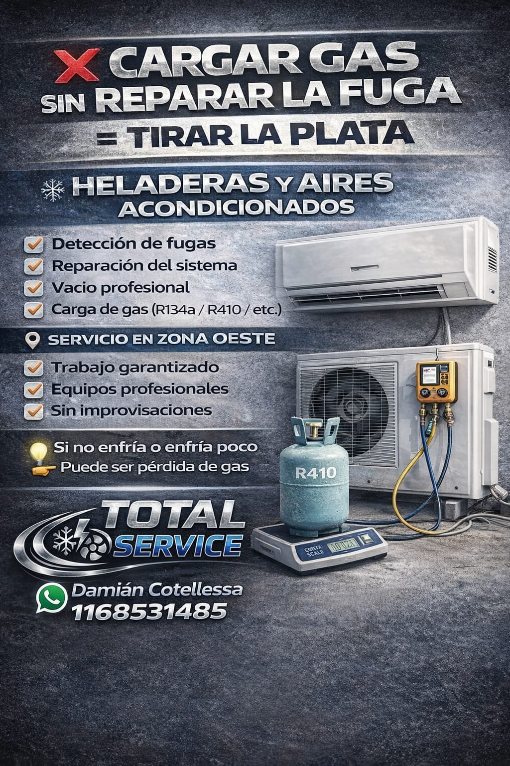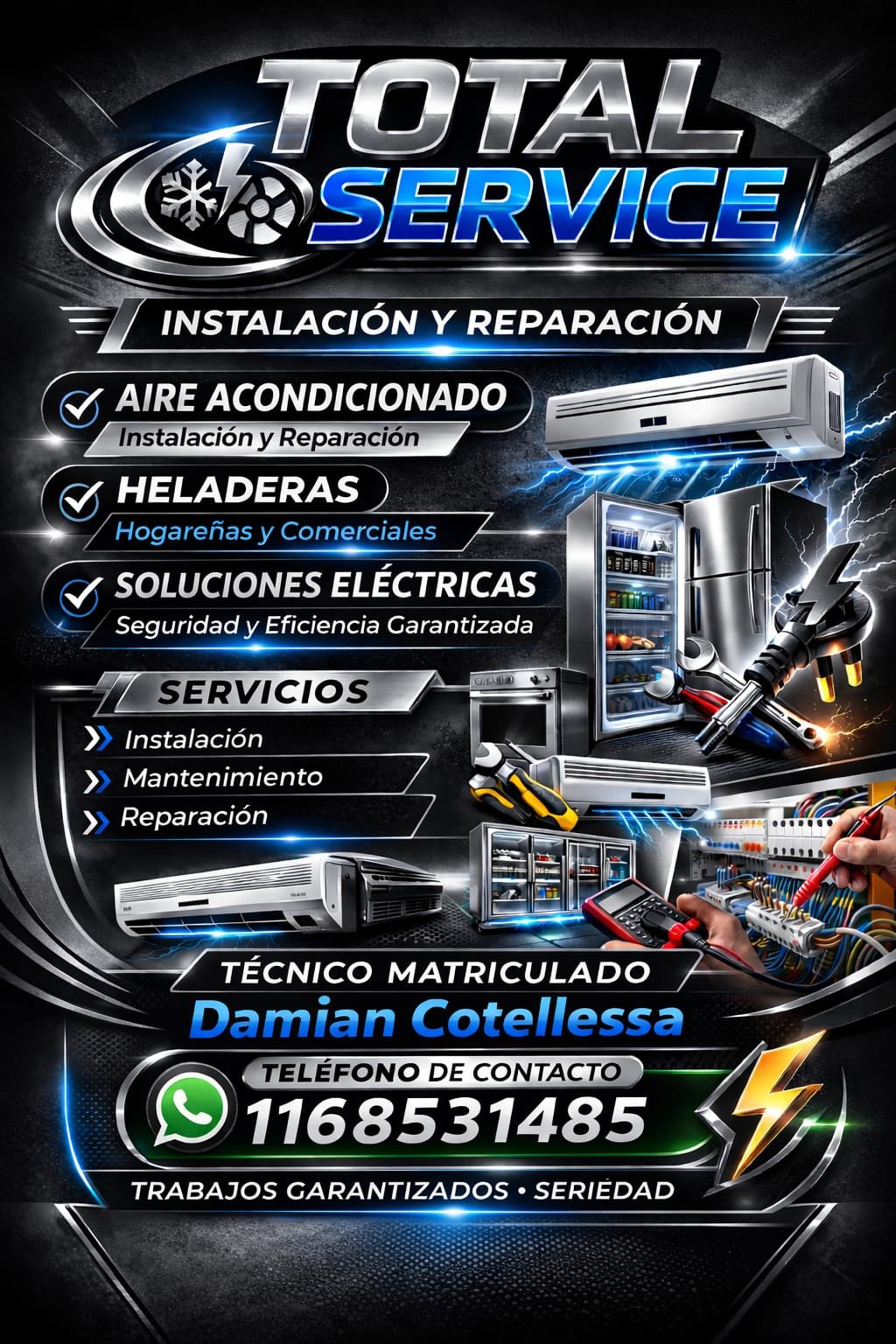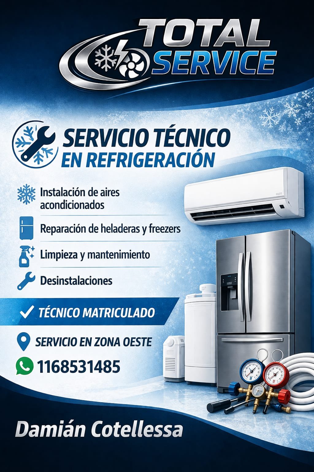 Técnico matriculado en refrigeración hogareña y comercial, instalación y reparación de aire acondicionado, heladeras, freezer, equipos comerciales. También realizó instalaciones eléctricas nuevas, reparaciones, y visitas de urgencia
